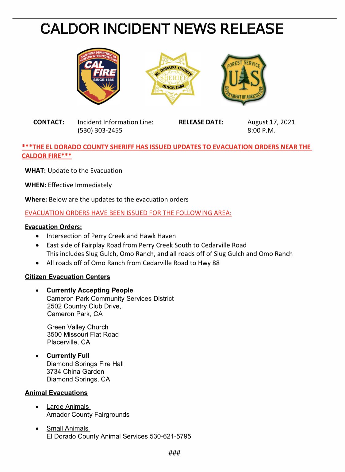 Cal Fire Aeu On Twitter The El Dorado County Sheriff Has Issued Updates To Evacuation Orders Near The Caldor Fire What Update To The Evacuation When Effective Immediately Where Below Are The